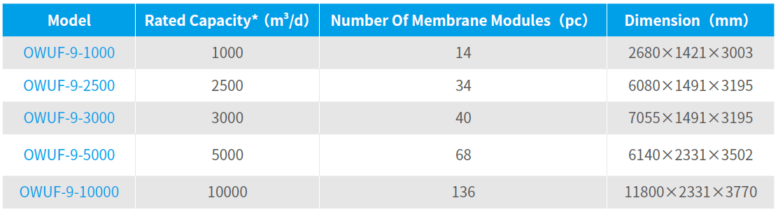 Notes: (1) *Treatment capacity at water temperature of 5℃ ;