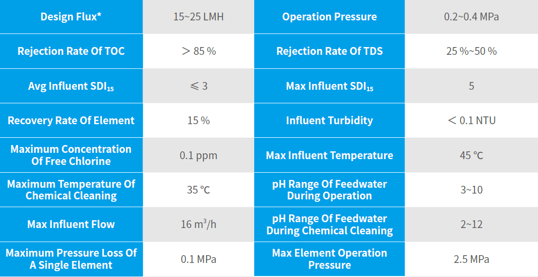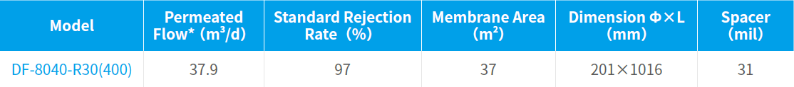 The DF30 (Ultra-Low-Pressure Selective Nanofiltration Membrane), as a low-pressure separate membrane of which molecular weight cutoff is 150~500 Dalton and that is selectively permeable to soluble inorganic salts, is featured with low operating pressure and high recovery rate. It can efficiently remove PPCPs, EDCs, micro organic pollutants, bacteria and virus and other microorganisms and retains the mineral substances. The product is one of the significant achievements in Major Science and Technology Program for Water Pollution Control and Treatment during “the 12th Five-Year Plan”, and it has been selected as the Major Environmental Protection Equipment Encouraged by the State and the First Major Technology and Equipment Demonstration Project in Zhongguancun National Independent Innovation Demonstration Zone. In addition, it has been awarded with multiple awards, such as the Beijing New Technology and New Products, the National Strategic Innovative Products and the National Key New Products, as well as the China Excellent Patent Award, the First Prize of Science and Technology Progress of Ministry of Education ,the Second Prize of National Scientific and Technological Progress Award ,etc.
