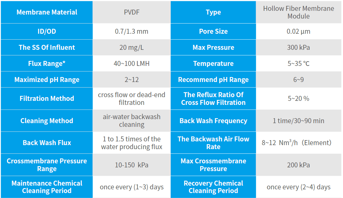 Excellent effluent quality: Narrow membrane pore size distribution, high filtration precision, more than 6log of bacterial retention rate, more than 41og of virus retention rate;