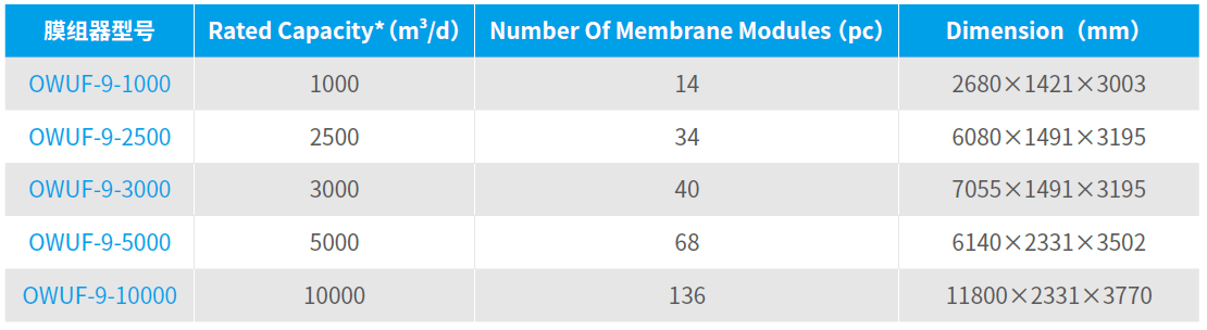 Notes: (1) *Treatment capacity with water temperature of 10℃ ;