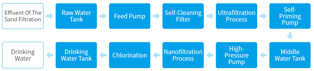 Product water includes ultrafiltration water produced, DF/RO water produced and DF/RO concentrated water. The packing machine can be adopted for soft bag packaging to meet different needs;