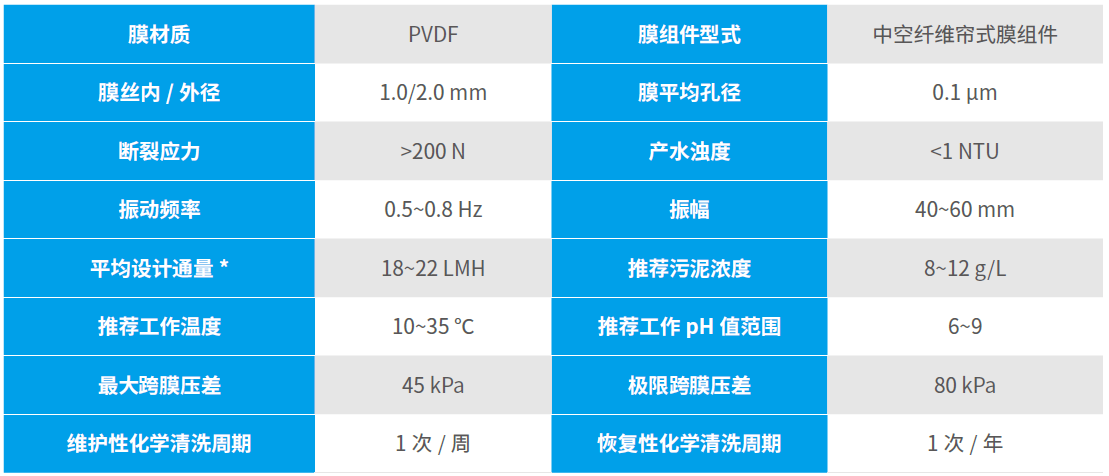 运行能耗低 自运动抗污染,无吹扫风机,单位产水振动能耗≤ 0.03 kW·h/m³;
