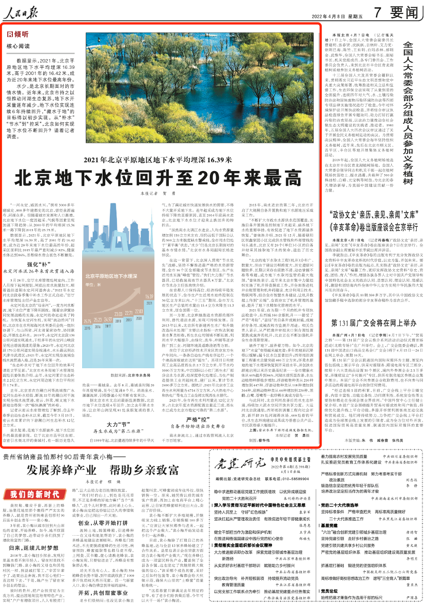 近年来,北京市持之以恒推动河湖生态复苏,地下水开采量逐年减少,地下水位实现连续6年持续回升。据来自北京市水务局的数据显示,2021年,北京平原地区地下水平均埋深16.39米,高于2001年的16.42米,成为近20年来地下水位最高的年份,超采区面积比2015年最严重时减少82%,健康水体达到86%,首都绿水青山底色不断擦亮。